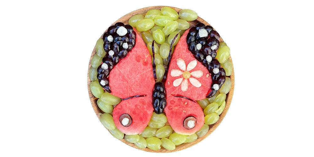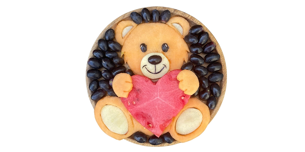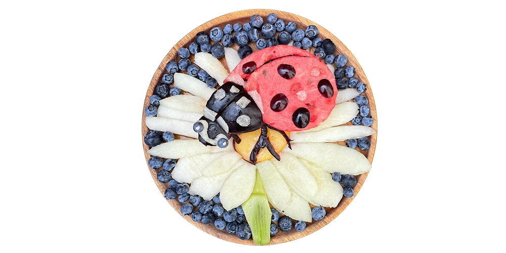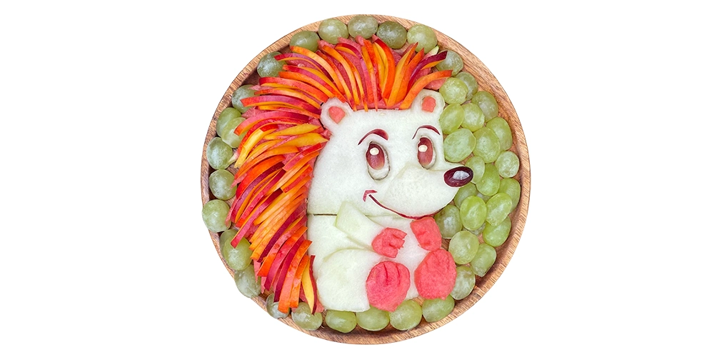 Create sheep and her four friends: hedgehog, ladybug, butterfly and bear. These simple fruit creations are perfect for beginners and a great way to combine creativity and healthy snacking.